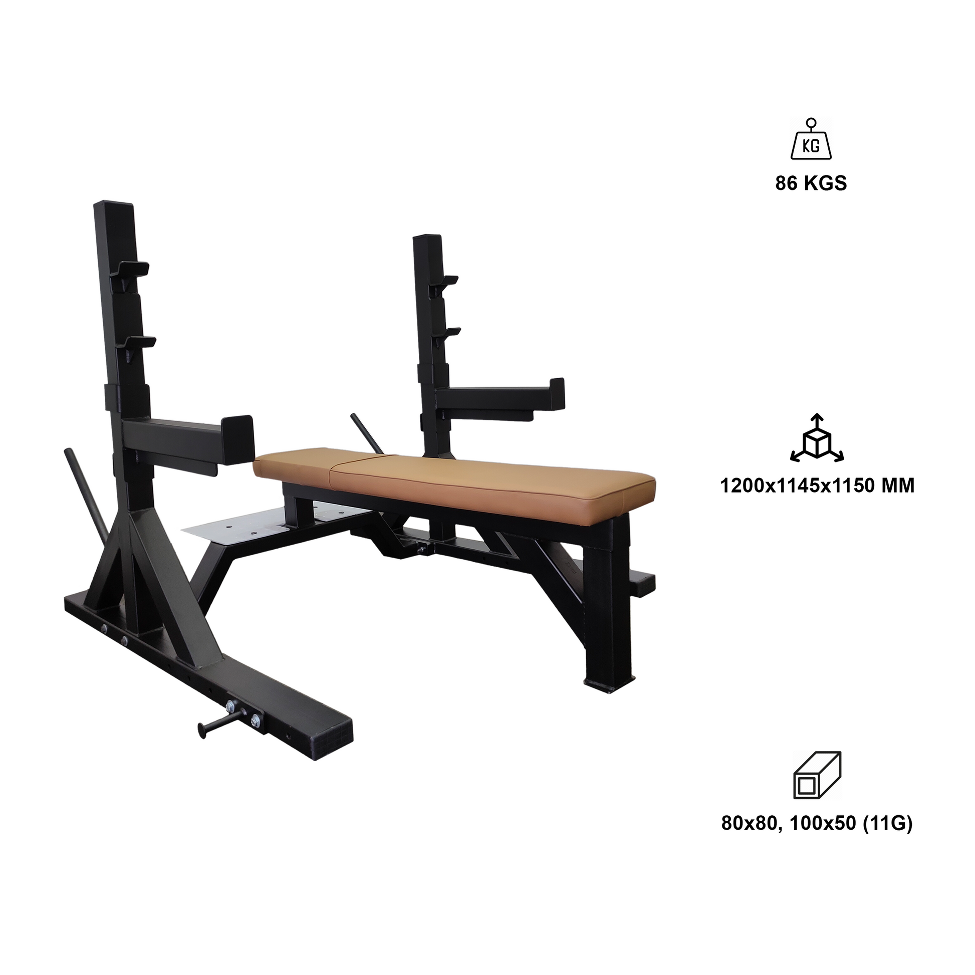 The dimensions of the bench are 1200x1305x1150MM, providing a spacious and ergonomic design that mirrors the specifications of competition-grade equipment. Additionally, the integrated spotter platform is perfect for training with a partner, enabling safe and effective assistance during lifts.