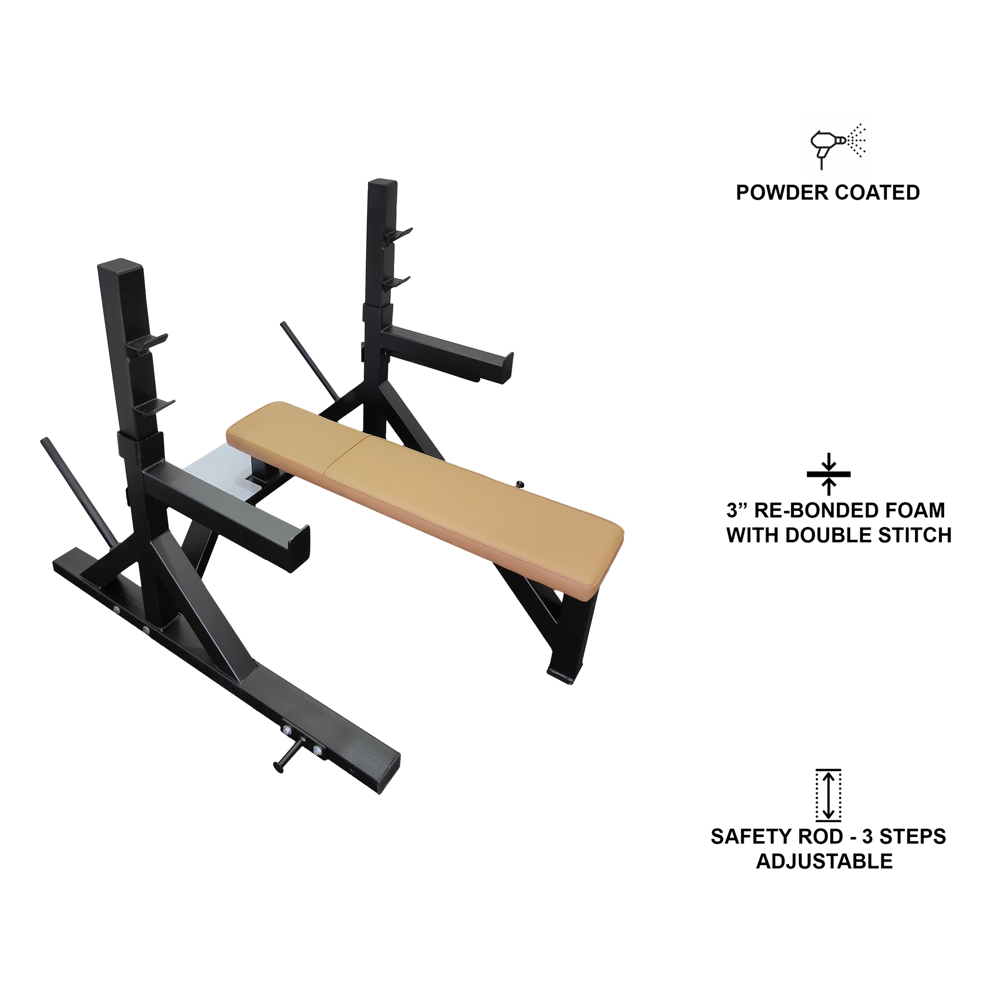 The bench features 2" re-bonded foam padding, providing optimal comfort and support. The foam is encased in a tough, double-stitched cover, designed to withstand heavy use and resist wear and tear. For enhanced safety and versatility, the bench includes adjustable safety rods with three height settings.
