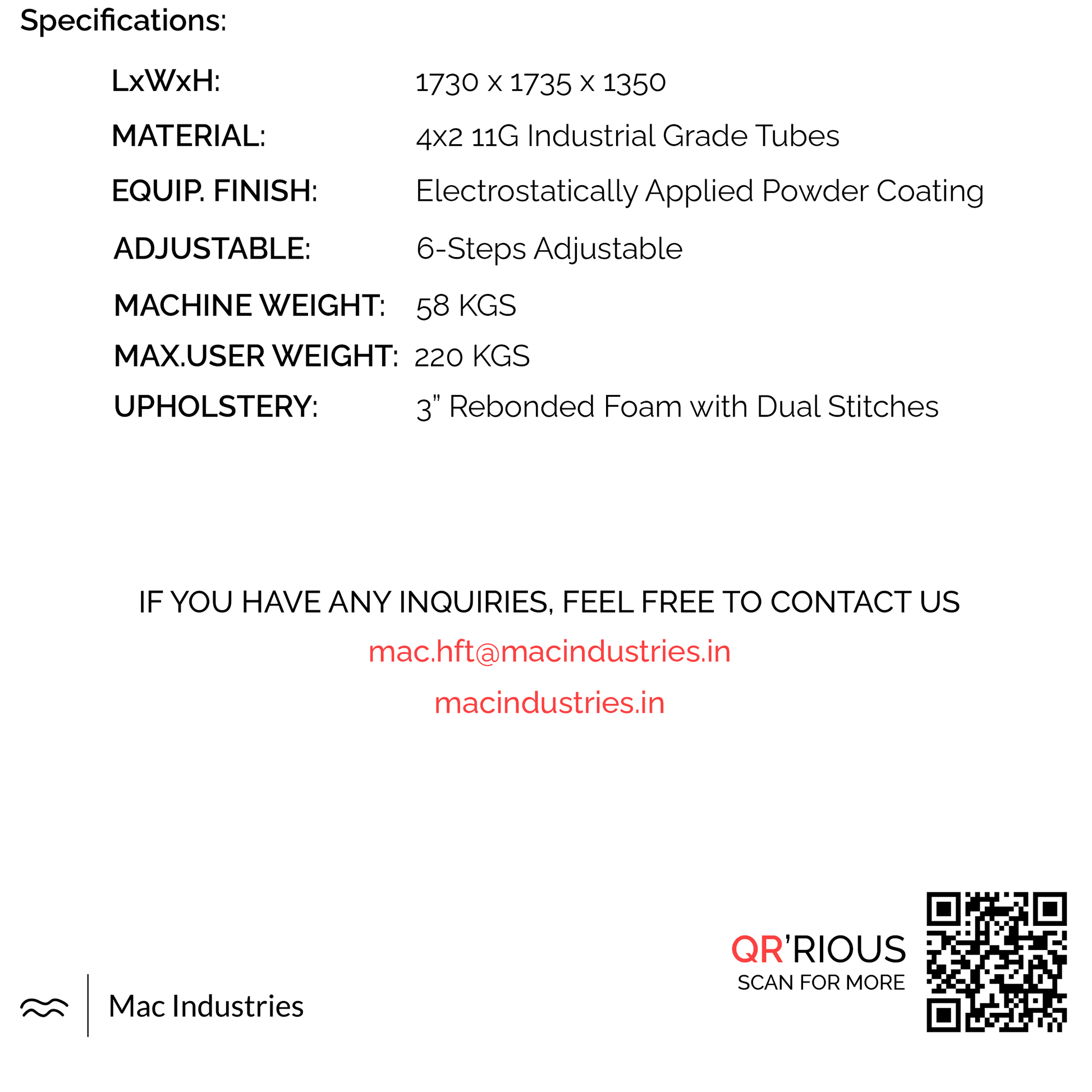 Elevate your chest workouts with the Mac Industries Chest Fly Machine, crafted for superior durability and stability. Constructed from high-quality 4x2 (100x50mm) heavy-duty MS Pipe, this equipment is built to last. Its powder-coated finish prevents chipping, rust, and corrosion, ensuring long-term resilience under intense workout conditions.